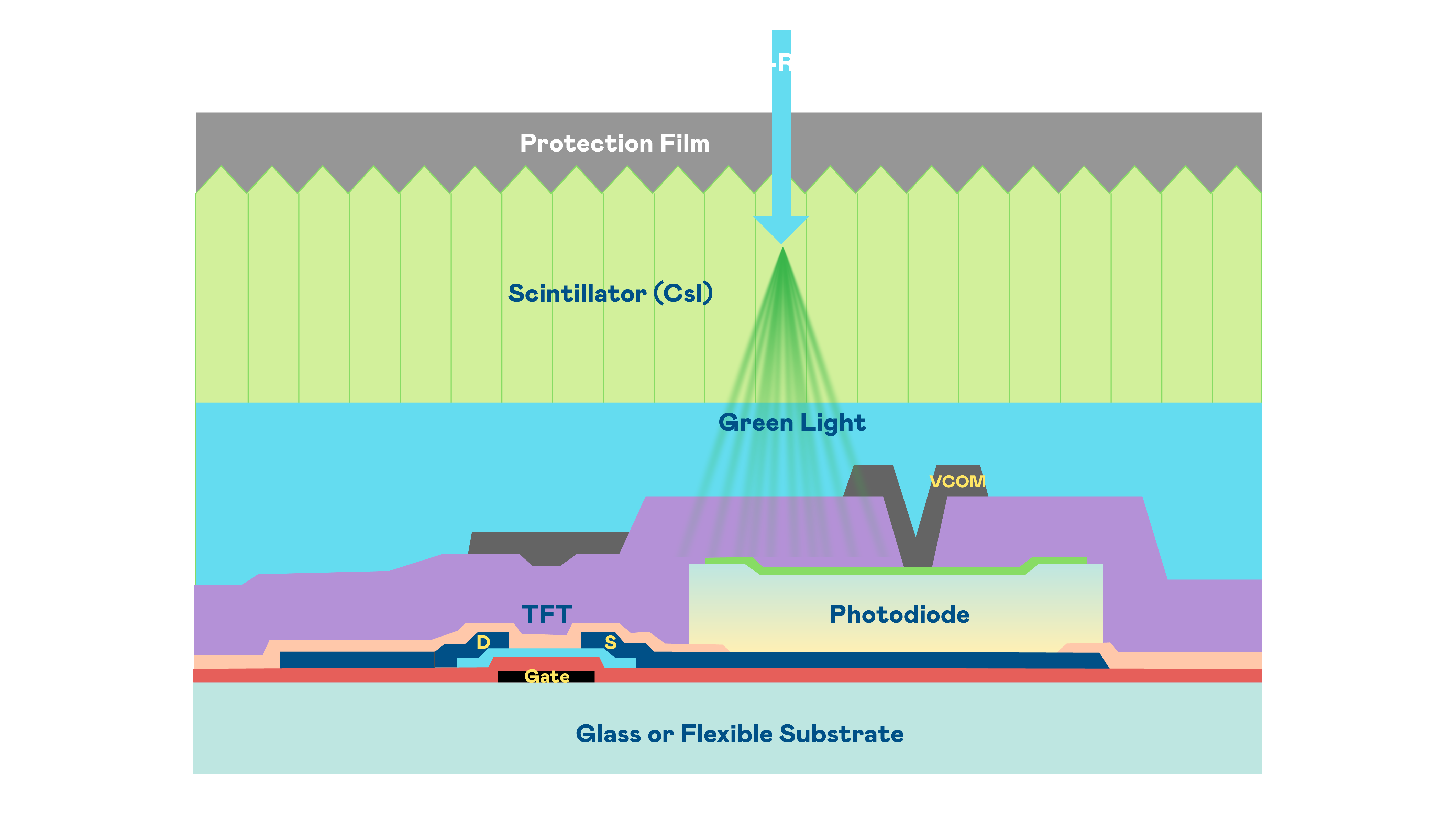 六合联盟官网的X光影像感測陣列使用薄膜電晶體 (TFT) 作為每個像素的讀取開關,搭配光電二極體(Photodiode)的光電轉換元件,用以感測X光影像訊號。